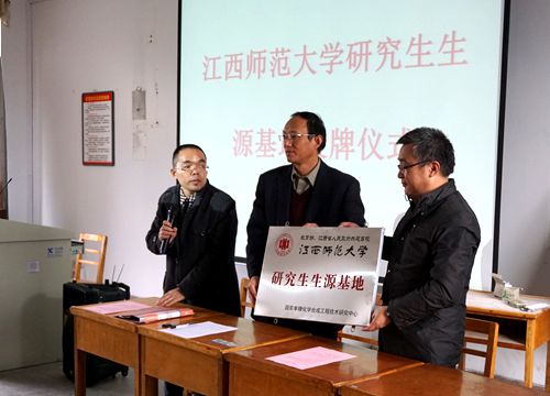 11月25日下午,化环学院在向学楼401教室隆重举行”江西师范大学研究生生源基地授牌” 仪式。受江西师范大学研究生院委托,江西师范大学国家单糖化学合成工程技术研究中心副主任熊斌研究员、孙建松博导代表江西师范大学参加授牌仪式,化环学院院长严平、党委书记刘新强及学生代表等共120余人参加授牌仪式。授牌仪式由化环学院副院长曹小华博士主持。