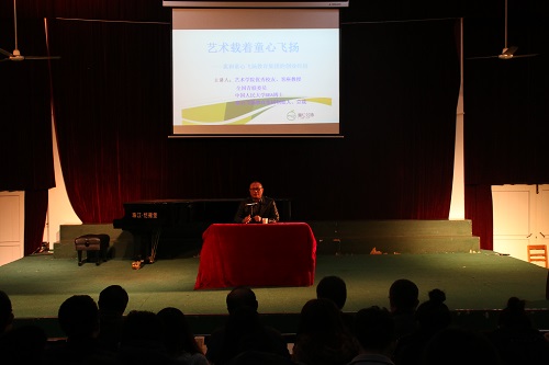 12月3日晚,艺术学院诚邀优秀校友,童心飞扬教育集团创办人、总裁李友建于香远楼一楼报告厅为师生们作了一场精彩的讲座。学院党委书记王春生、党委副书记沈杨、团委书记刘元明及辅导员老师与音乐学专业学生和全院学生干部近500人共同参加和聆听了此次讲座。讲座由沈杨副书记主持。