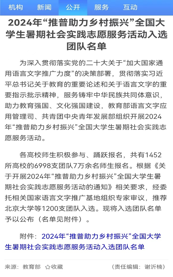 近日,九江学院文学院组织申报的“文小青”志愿服务队入选由教育部语言文字应用管理司、共青团中央青年发展部组织开展的2024年“推普助力乡村振兴”全国大学生暑期社会实践志愿服务队。本次活动共有1452所高校的6998支团队,共计7万余名师生报名参与,经过严格的专家审议,我校文学院团队成功入选。