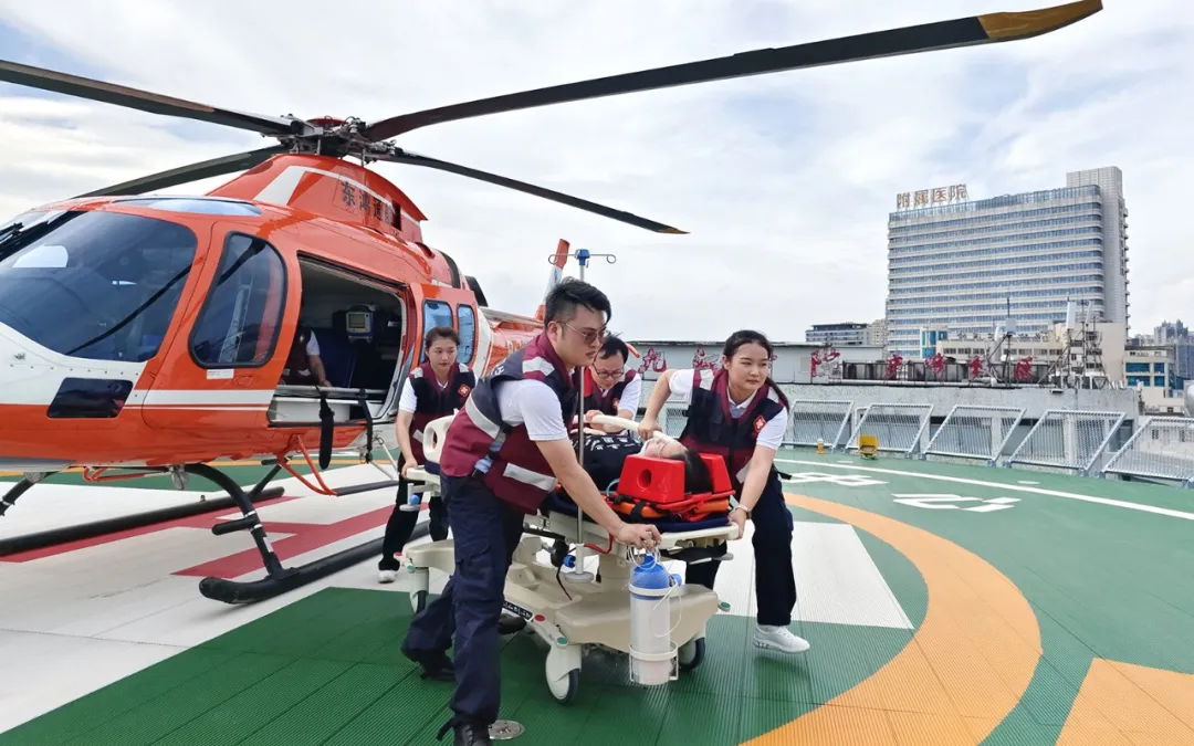 2024年7月9日,一架航空医疗救护直升机稳稳停落在江西省脑血管病区域医疗中心顶楼停机坪。这是省级区域医疗中心开展的首次航空救援模拟实战演练。为快速形成区域应急救援辐射力,确保危重患者得到快速高效救治,医院协同江西省第11紧急救援队(航空救援小组)、九江市急救中心等,打造立体化综合应急救援体系,实现了空中医疗转运与地面医疗抢救的无缝衔接,有力提升了区域医疗中心在特殊和紧急情况下的航空医疗救援能力。