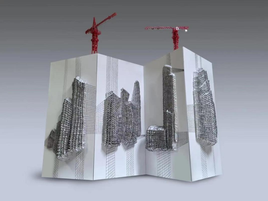 作品说明:这件作品是谭丹武老师近几年“筋骨”系列作品的延续。灵感源自陶瓷印坯工艺内部的支撑结构,称之为“筋”,这种骨架结构与现代建筑中的钢筋水泥具有相同的功能。作品以中国城市中的现代建筑为创作对象,旨在呈现新中国成立以来在城市建设中取得的瞩目成就,见证大国建造和中国速度的辉煌成果。作品顶部的塔吊加入了动态装置,能更生动形象地展现出建设过程的活力与动态。创作采用手捏成型的方式,这能更好地表现泥土本身的材料语言,通过透视线的延伸处理,加强对作品空间的想象力。作品中线条的造型语言、黑白的东方美学、留白的画面意境、屏风的折叠效果等都展现对中国传统艺术和审美的思考。
