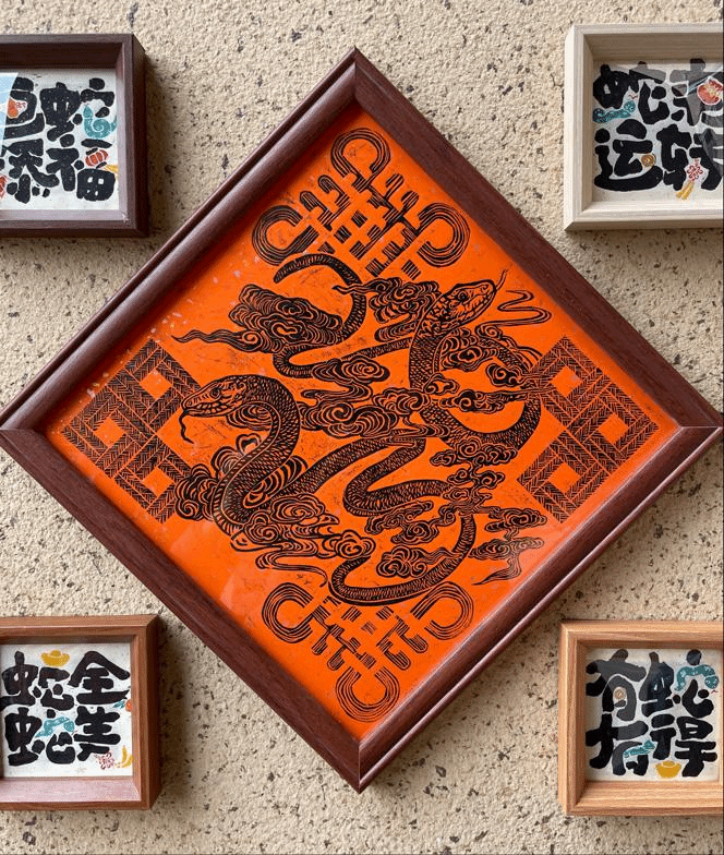 这场以“印蛇得福”为主题的新年版画展展出了九江学院艺术学院青年教师周婷及其指导学生们制作的40余幅蛇年主题版画以及部分版画基础课程的课程作业。