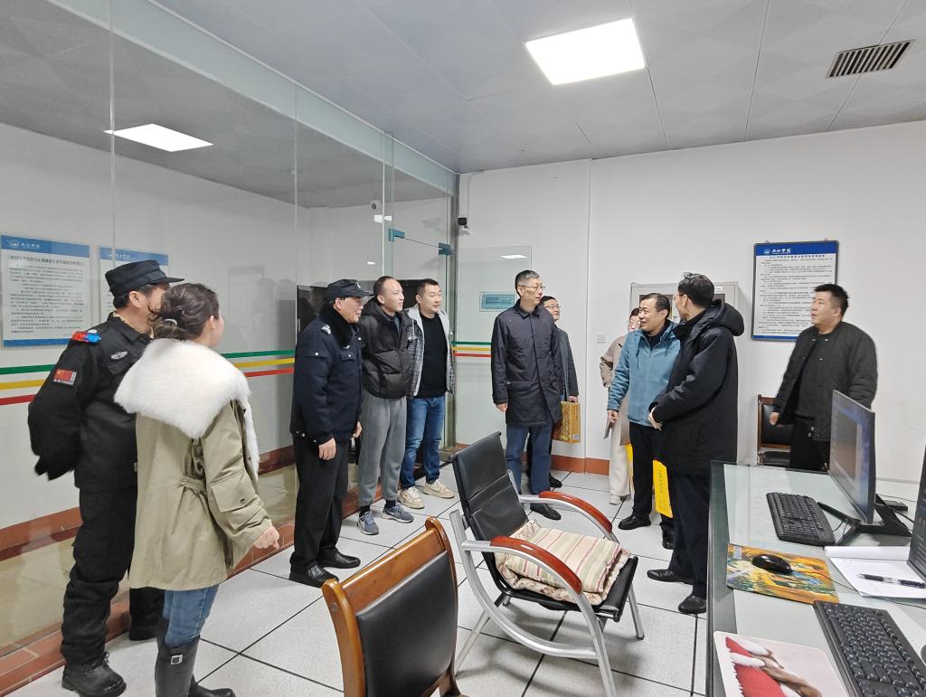 王殿元一行先后走访了智能智造工程实训中心项目部、学校水电管理中心、保卫处视频监控中心、九江学院社区便民服务中心、行政楼值班室等处。王殿元详细询问了寒假期间学校安全保卫、消防管理、电力保障、便民服务以及项目建设等方面的情况。他表示,寒假期间的九江学院由大家共同守护,要全方位加强假期安全管理、后勤管理,确保校园安全稳定,保障留校师生生活需求。