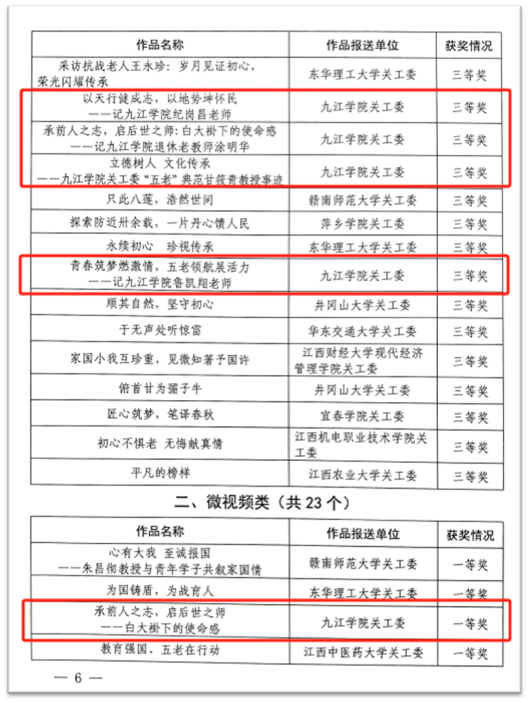 同时,江西省教育厅关工委公布了2024年我省高校“读懂中国”活动评审结果,我校参赛的14篇征文作品中9篇获奖和2个微视频作品全部获奖,微视频获奖率高达100%,征文获奖率达64.2%,其中,文学院选送的《几十载春风化雨,弦歌不辍育青葱》获征文类一等奖,护理学院、旅游学院、文学院、材料科学与工程学院、基础医学院、计算机与大数据科学学院等选送的作品分别荣获二、三等奖,基础医学院选送的《承前人之志,启后世之师——白大褂下的使命感》获微视频类一等奖,文学院选送的《老骥伏枥,立德树人》获微视频类二等奖。