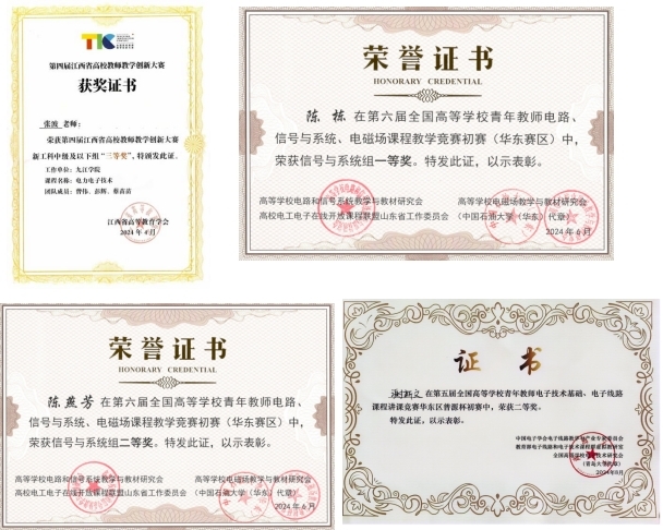 学院通过引进培养相结合,近几年,先后引进硕士博士2人,国内外送培博士6人,现有博士学位教师16人,占专任教师比例为30.2%。加强双师双能型队伍建设,目前通过江西省双师型认证教师40人,占专任教师总人数的77%。积极鼓励教师参加江西省高校教师教学创新大赛等活动,促进教师教学能力提升。近3年,入选2024年江西省教学成果奖青年培育项目立项1项,获批校级教学成果奖3项。在第四届江西省高校教师教学创新大赛中获省级三等奖1项,在全国高等学校青年教师电路、信号与系统、电磁场课程等教学竞赛获一等奖1项,二等奖4项。