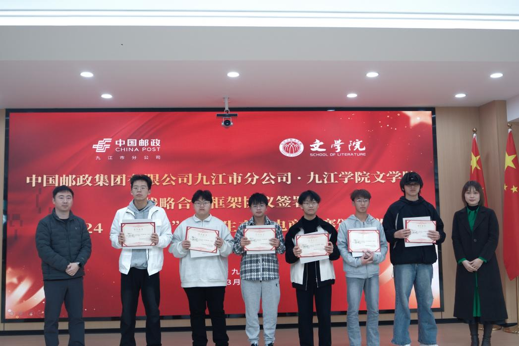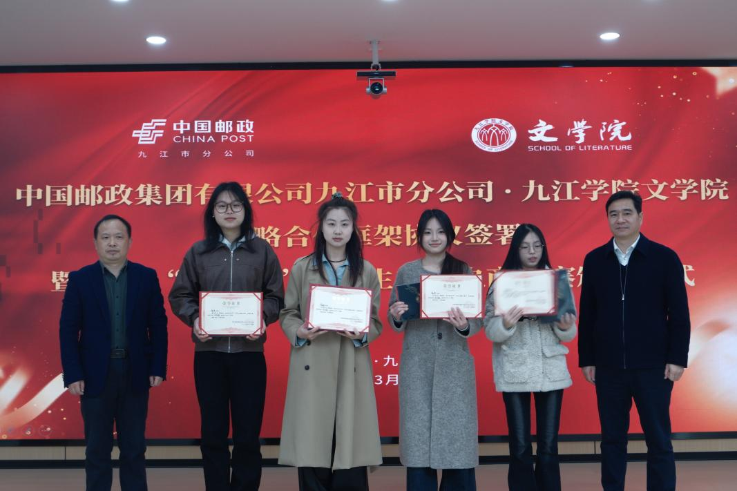 3月19日上午,中国邮政集团有限公司九江市分公司与文学院战略合作协议签署仪式暨2024 “赣邮杯”大学生直播电商大赛颁奖仪式,在中国邮政九江市分公司会议室举行。此次活动聚焦深化校企合作,旨在推动直播电商、文创等领域的产教融合,为地方文化经济发展注入全新动力。