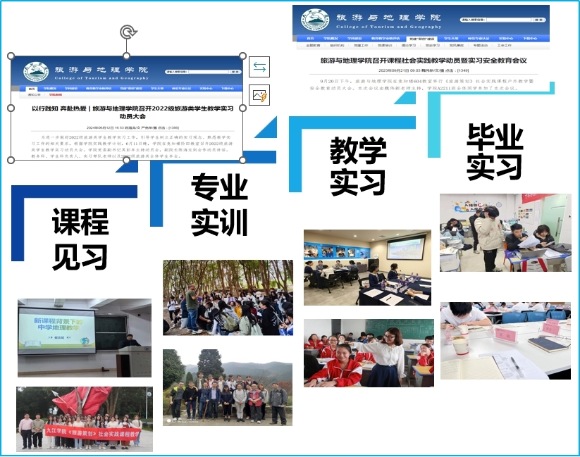 学院建成旅游管理实验教学中心和地理科学实验教学中心,总面积约4000平方米,设备投资总额1000余万元。其中旅游管理实验教学中心为省级实验教学示范中心。实习基地分布在经济发达地区的高星级酒店、知名景区、航空公司、规划测绘公司,以及九江市中学等不同行业部门。
