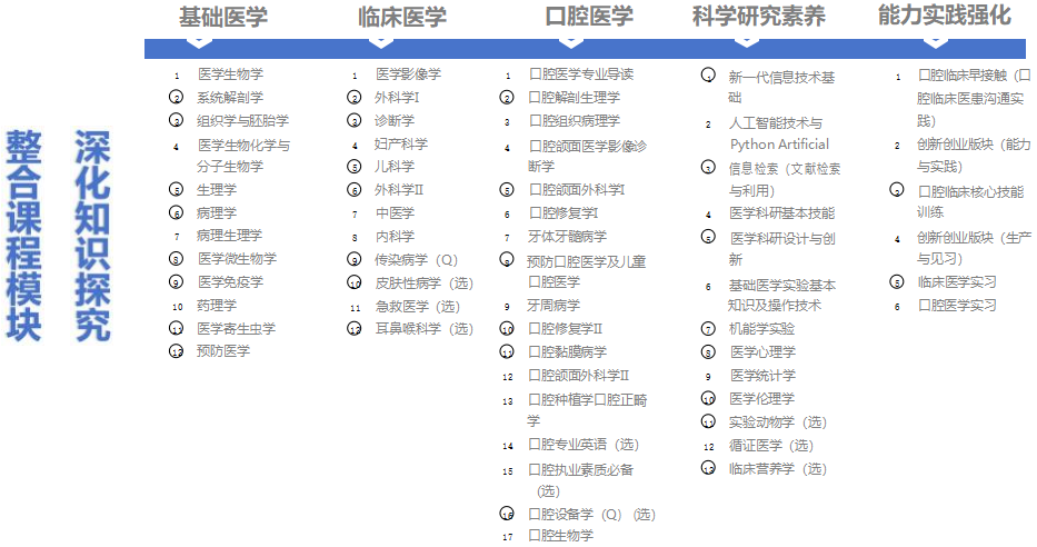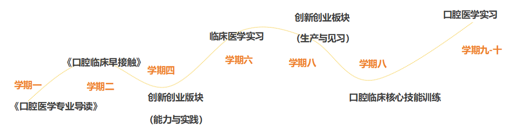 ——专业认知实践→ 医患沟通临床见习→社区见习→课内实验→课间见习→ 临床实习→专业病例临床见习→ 口腔临 床核心技能训练→ 口腔医学实习(含口腔临床技能强化训练及口腔技能 OSCE 考核)。