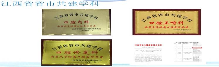 医院是我国中西部地区儿童口腔健康预防干预项目(窝沟封闭)九江市实施定点医院、美国国际“微笑列车 ”(唇腭 裂免费治疗)赣北地区免费手术定点单位、国际唇腭裂治疗基地、中南地区口腔专科医联体成员单位、上海交通大学医学 院附属第九人民医院集团口腔修复专科联盟合作单位、江西省“光明 ·微笑 ”工程唇腭裂治疗合作定点医院、江西省口腔 医学会副会长单位、九江市口腔医学会会长单位、九江市口腔质控中心、国家级“ 口腔全科 ”住院医师规范化培训基地、 九江市名医工作室( 口腔科)、九江市口腔专科联盟理事长单位。