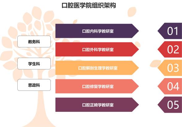 组织架构:口腔医学院的教学管理架构包括教务科、学生科、思政科及 5 个教研室( 口腔内科学、口腔修复学、口腔 正畸学、 口腔外科学、 口腔解剖生理学)。