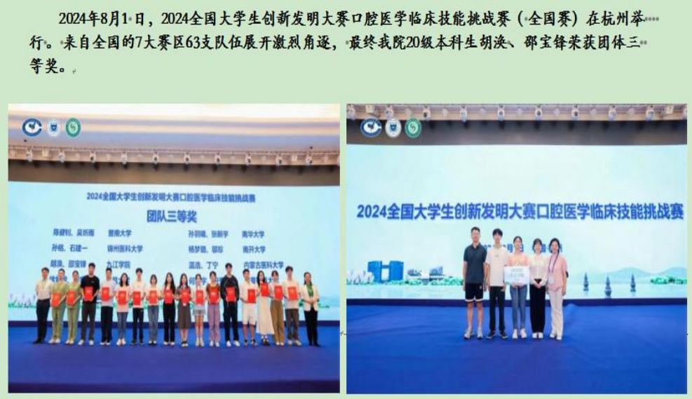 学院坚持立德树人,注重培养学生的综合素质。通过开展丰富多彩的校园文化活动、学科竞赛活动和创新创业活动, 学院培养了一批德才兼备、全面发展的优秀学生。近年来,学院学生在全国口腔医学本科生临床操作技能大赛、创新创业 大赛等各类比赛中屡获佳绩,展现了学院学生的良好精神风貌和专业素养。