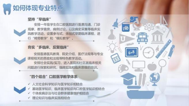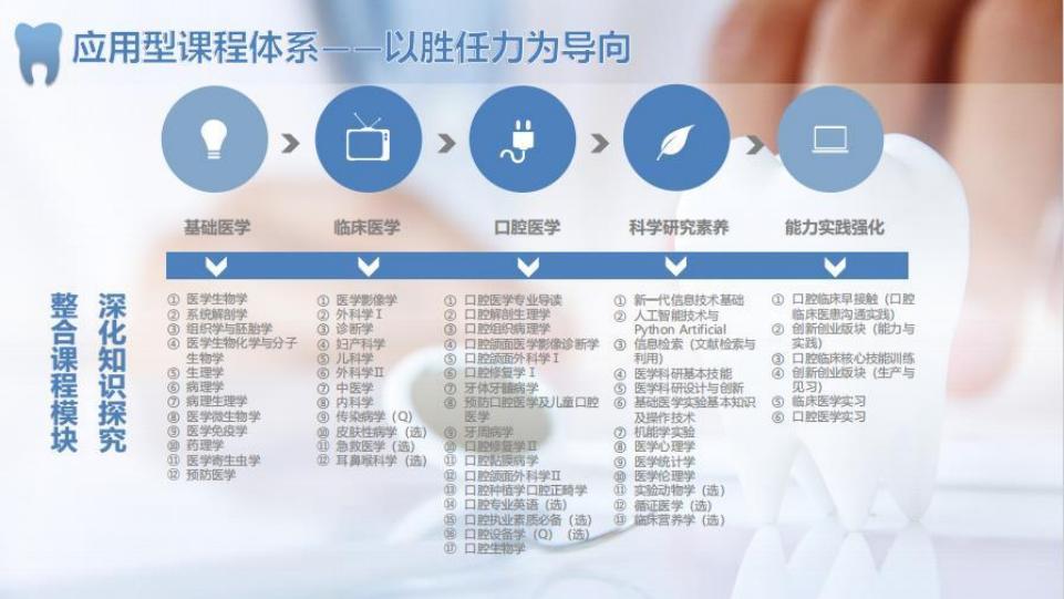学院以培养高素质应用型口腔医学人才为目标,不断优化人才培养模式。在课程设置上,注重理论与实践相结合,增 加实践教学比重,开设了多门实践课程和实验课程。同时,学院积极开展校企合作,与多家口腔医院和诊所建立了实习基 地,为学生提供了丰富的实践机会。此外,学院还鼓励学生参加各类学科竞赛和创新创业活动,培养学生的创新能力和实践能力。