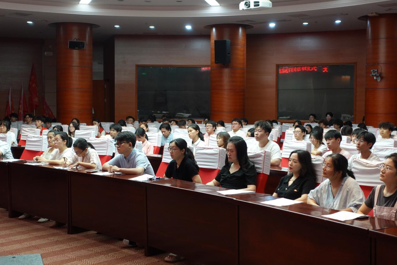 团委负责人介绍了2025年暑期社会实践的筹备情况;社会实践服务队指导教师代表谢彬作了经验分享;学生代表彭诗荣作了表态发言;与会领导为社会实践服务队进行授旗。