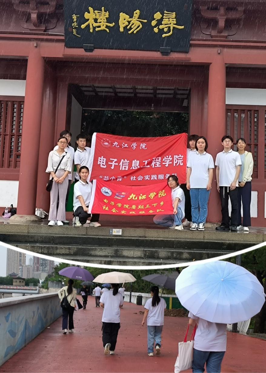 今年,电子信息工程学院对接的文明实践站是延支山社区新时代文明实践站,该实践站地处长江沿岸。6月22日,指导教师带领服务队沿长江岸线开展实地文化研学,从锁江楼、浔阳楼到琵琶亭,既是地理空间的延伸,更是一场穿越唐宋的诗意巡礼——锁江塔的坚韧、浔阳楼的豪情、琵琶亭的苍茫,都在长江的涛声里化作可触可感的文明脉动,让同学们感受到九江绵延千年的文脉传承。