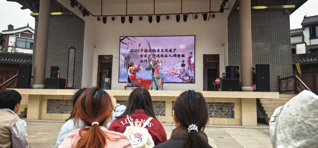 上午10点,师生抵达古城。该地属于庐山市旅游示范点,致力于将传统戏曲文化与现代旅游产业深度融合,旨在为游客提供独具特色的观戏体验与高品质旅游服务。在古城戏台,学员们观赏到原汁原味的西河戏传统剧目表演。演员们身着古韵十足的戏服,以惟妙惟肖的演绎,吸引了全场目光,赢得一致称赞。学员们沉浸在唱念做打的精彩之中,深深折服于传统戏曲艺术的独特魅力。