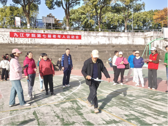 11月27日下午,九江学院南区篮球场上欢声笑语、气氛热烈,学校第七届老年人运动会开幕。来自主校区、浔东校区、庐峰校区和南湖校区的75名退休老同志齐聚一堂,以饱满的热情参与了套圈、托球跑、垒球掷准等多项趣味运动,展现了我校离退休教师“老当益壮、乐享银龄”的精神风貌。