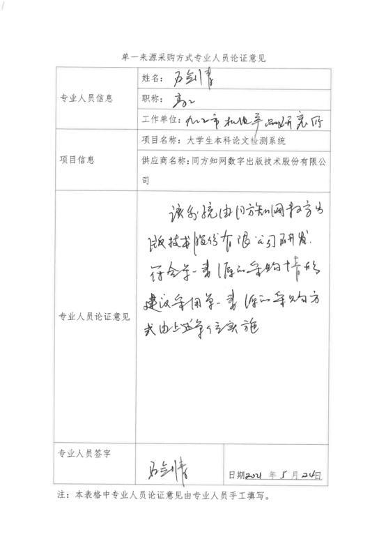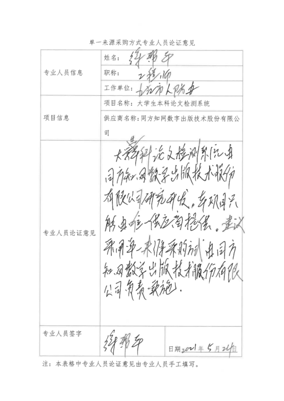 采用单一来源采购方式的原因及说明:“大学生本科论文检测系统”是由同方知网数字出版技术股份有限公司自主研发,符合政府单一来源情形,建议采用单一来源采购方式,由同方知网数字出版技术股份有限公司负责实施。